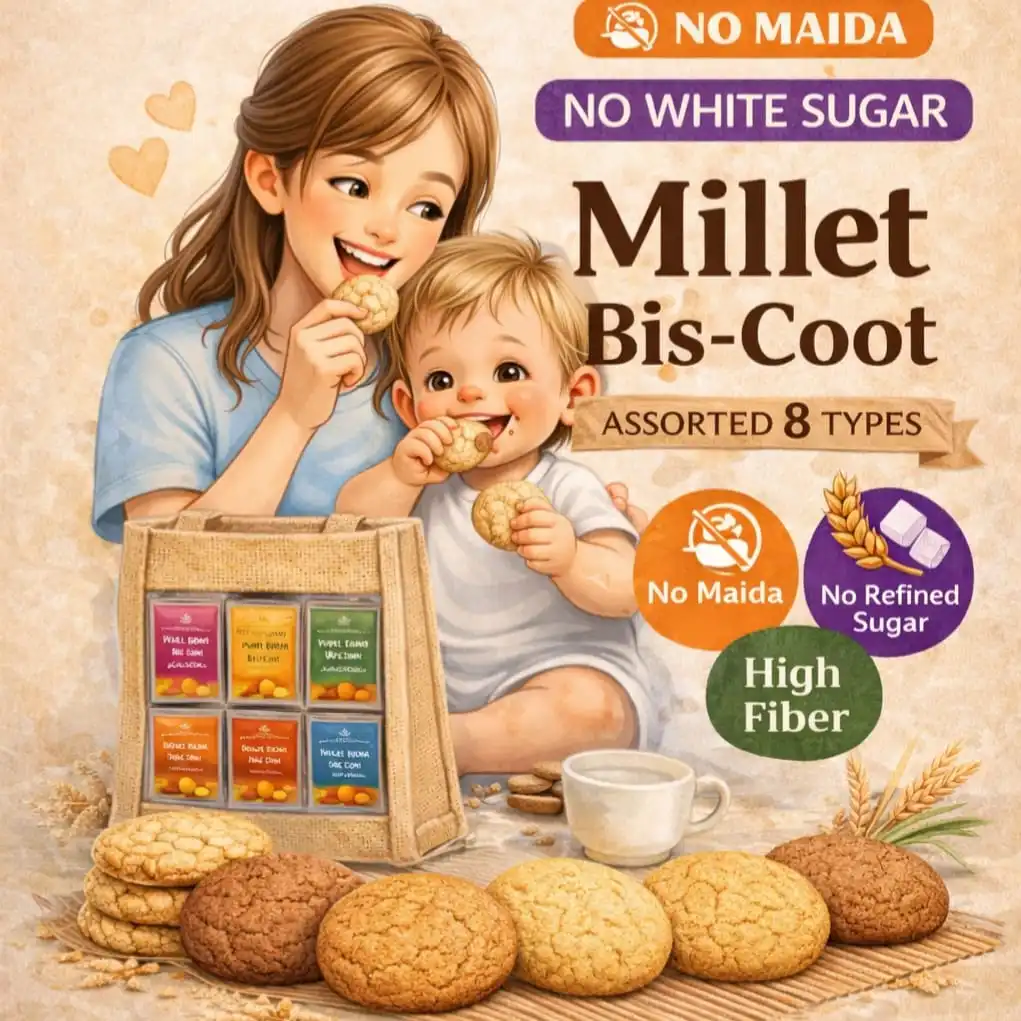 Healthy, baked cookies made with real millets, jaggery, and butter — perfect for guilt-free snacking.